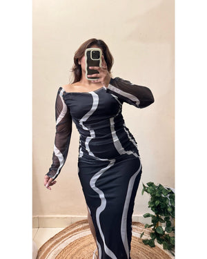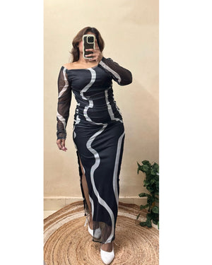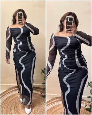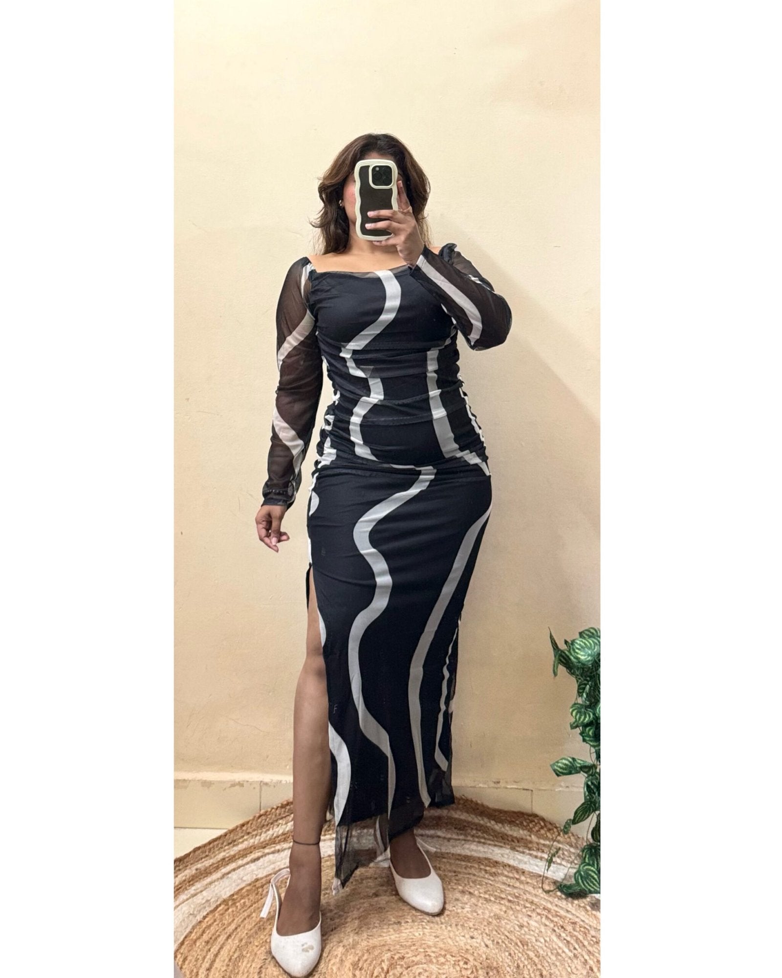 Black Wavy Print Mesh Slit Cut Mesh Bodycon Dress