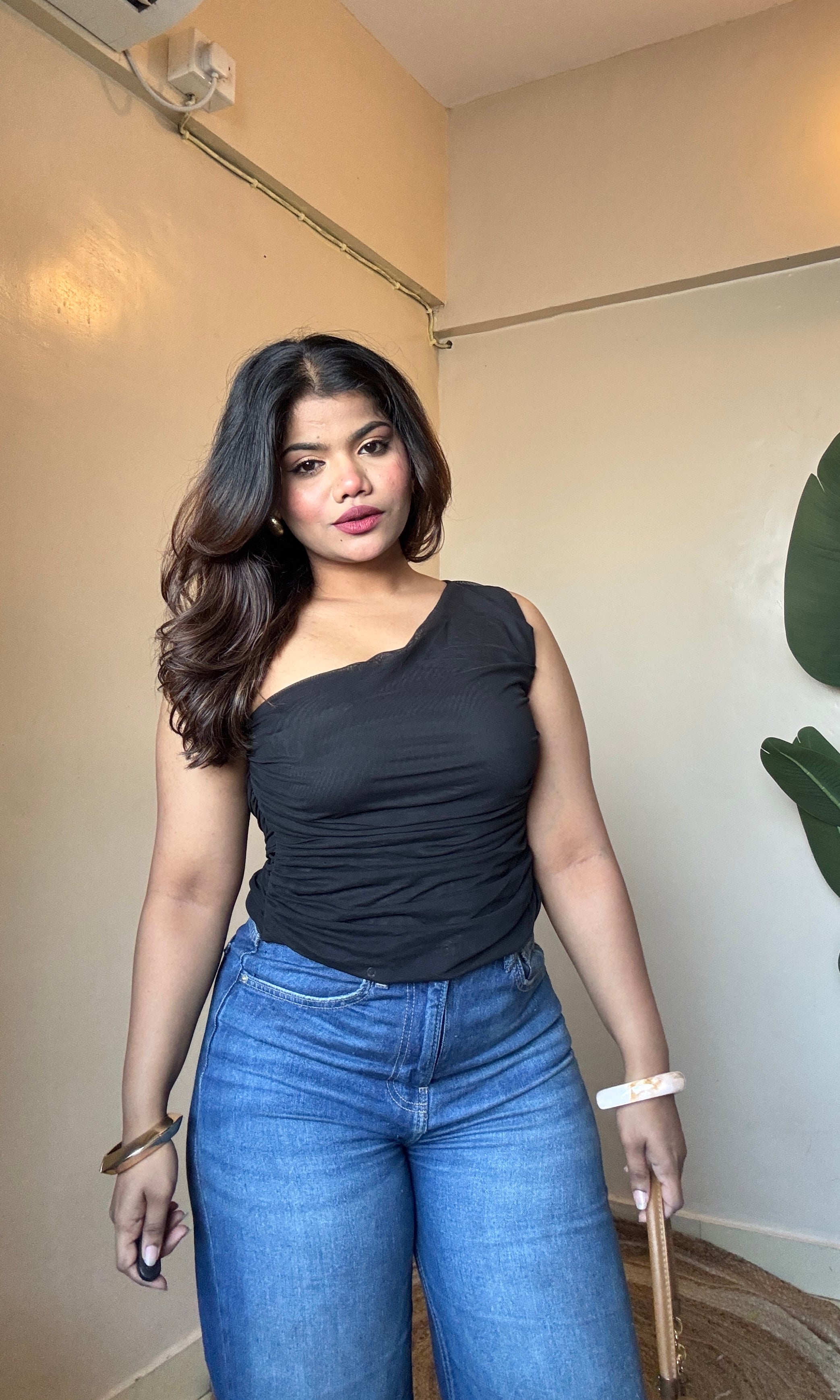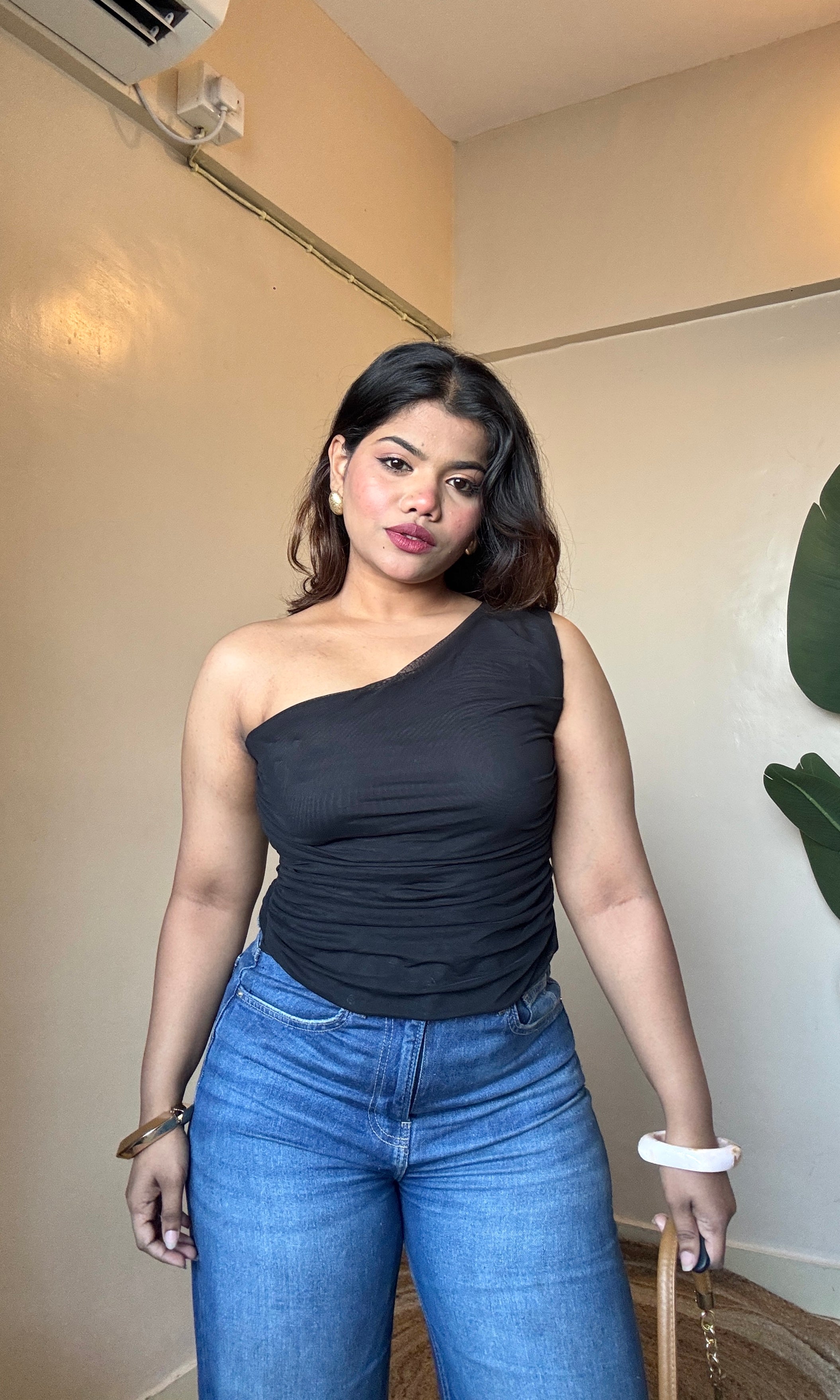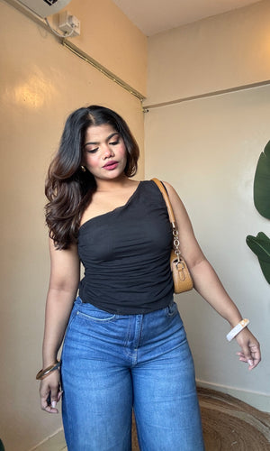 Black One-Shoulder Mesh Top