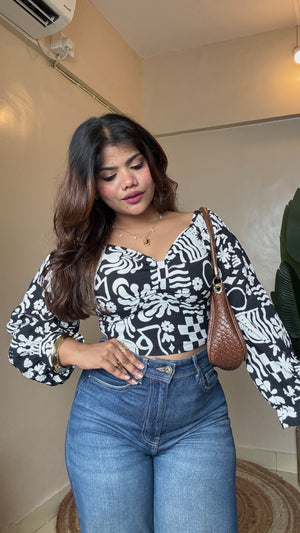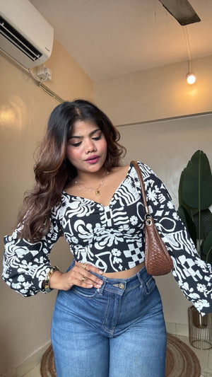 Black White Printed Puffy Sleeve Top
