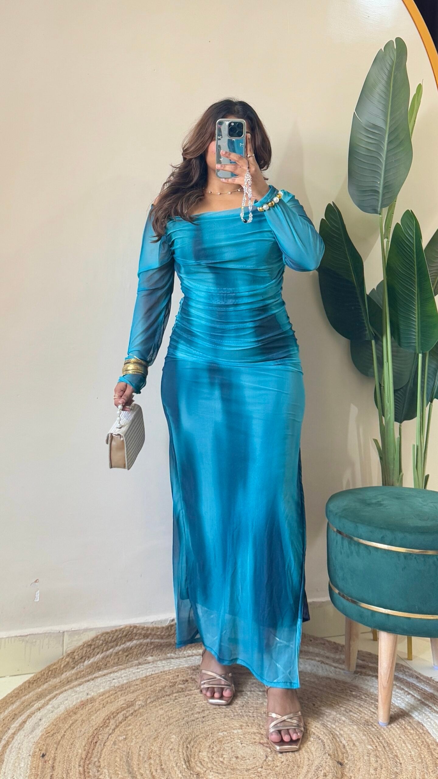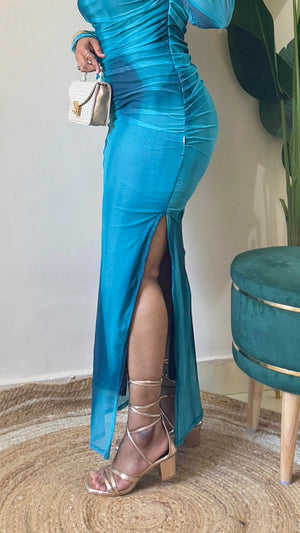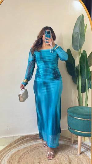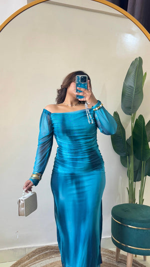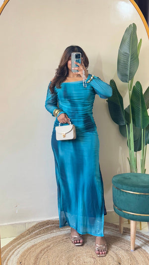 Blue Marble Print Mesh Ruched Dress