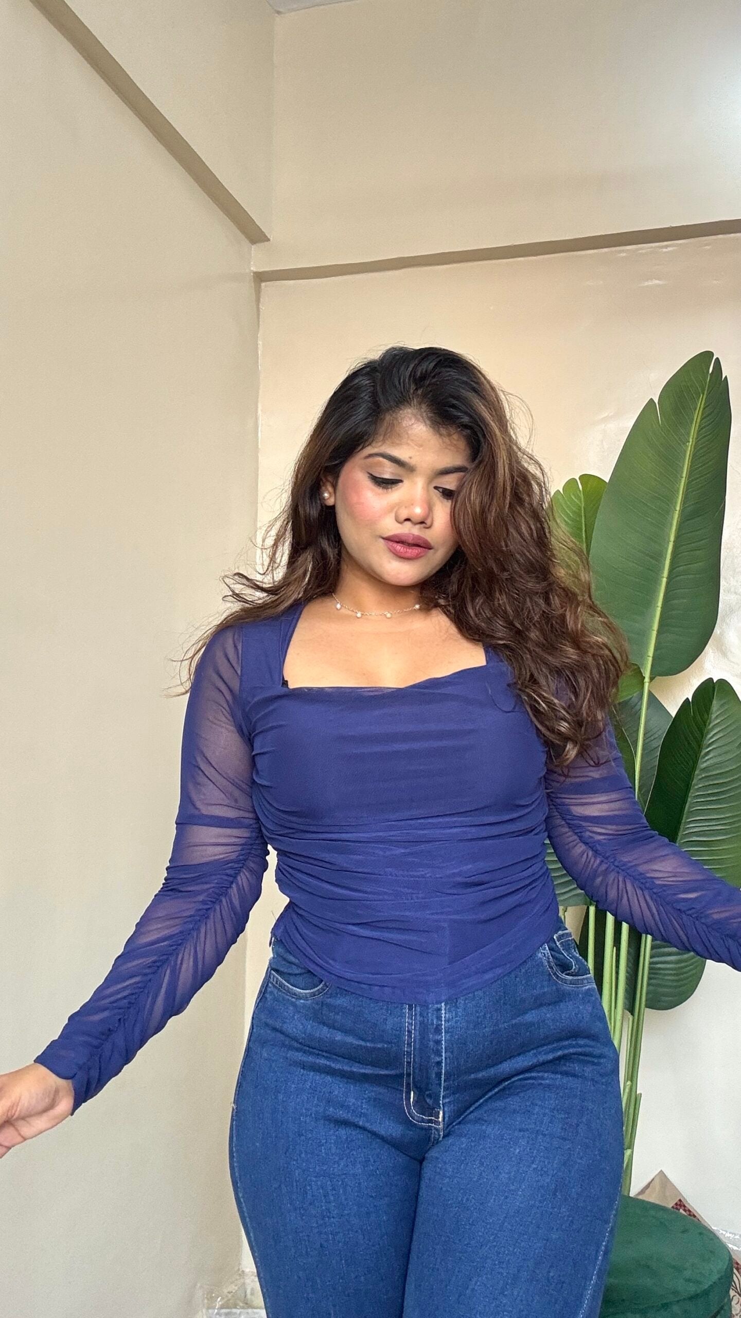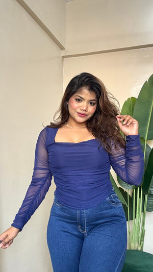 Blue Ruched Mesh Top