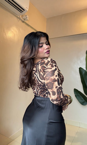 Cheetah Printed Rhinestone Work Mesh Top With Inner
