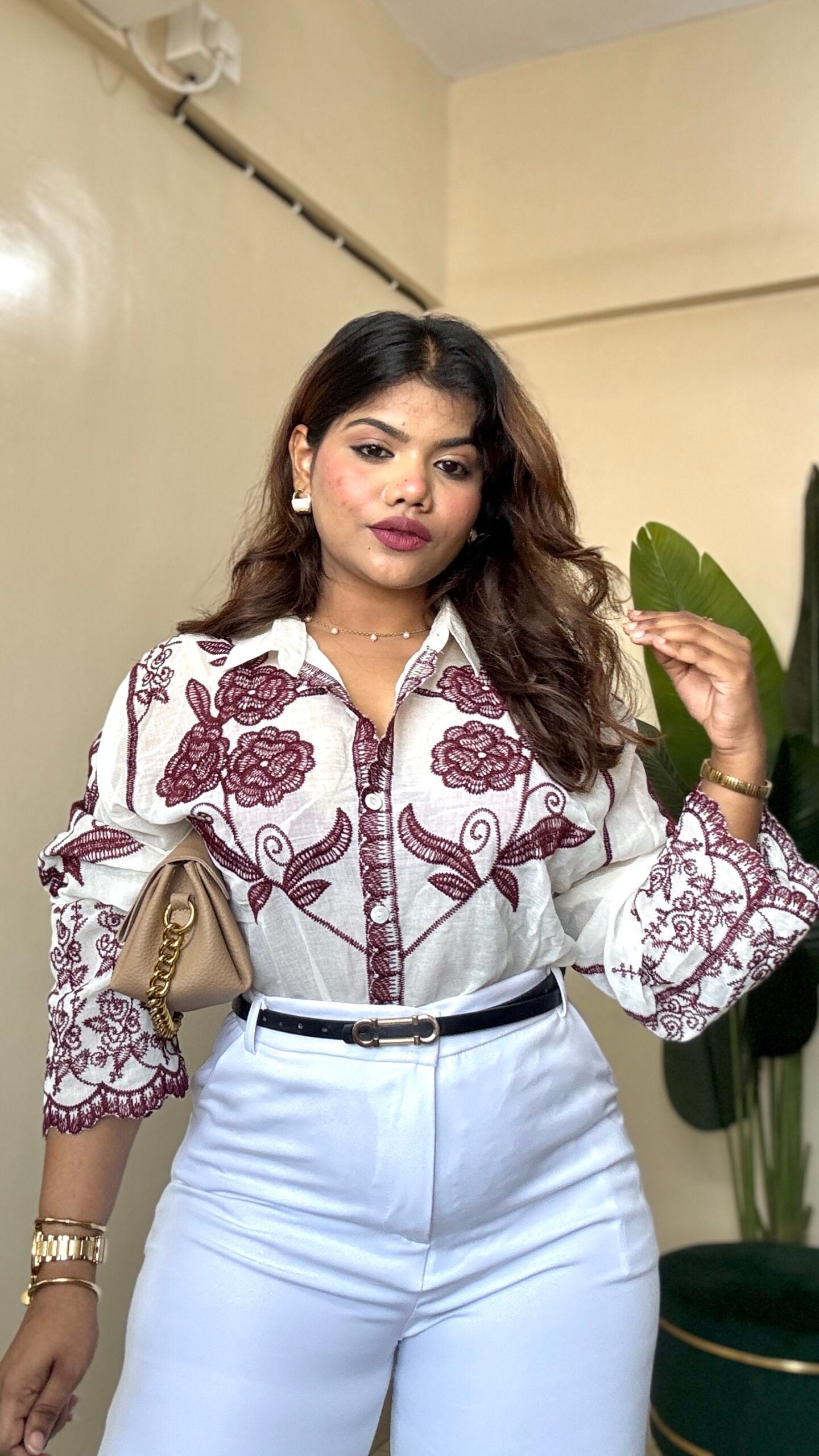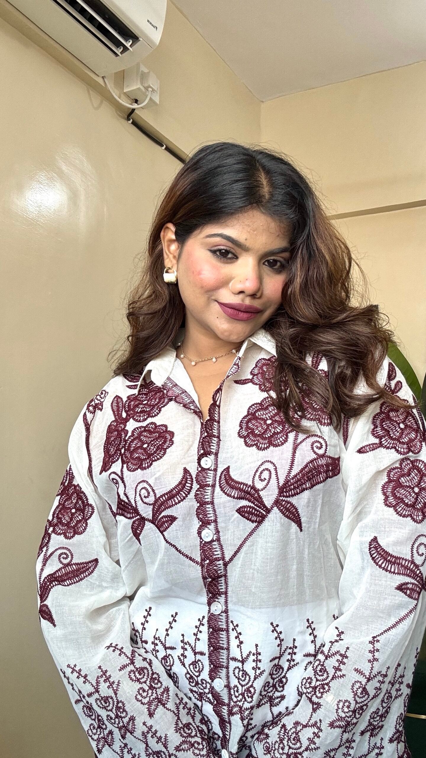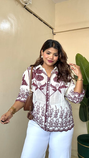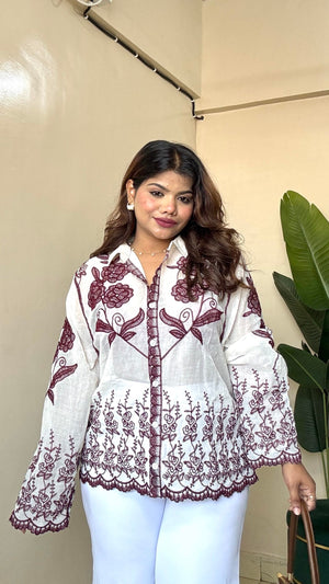 Wine Rose Embroidery Khadi Shirt (Free Size: 34-40 Bust)