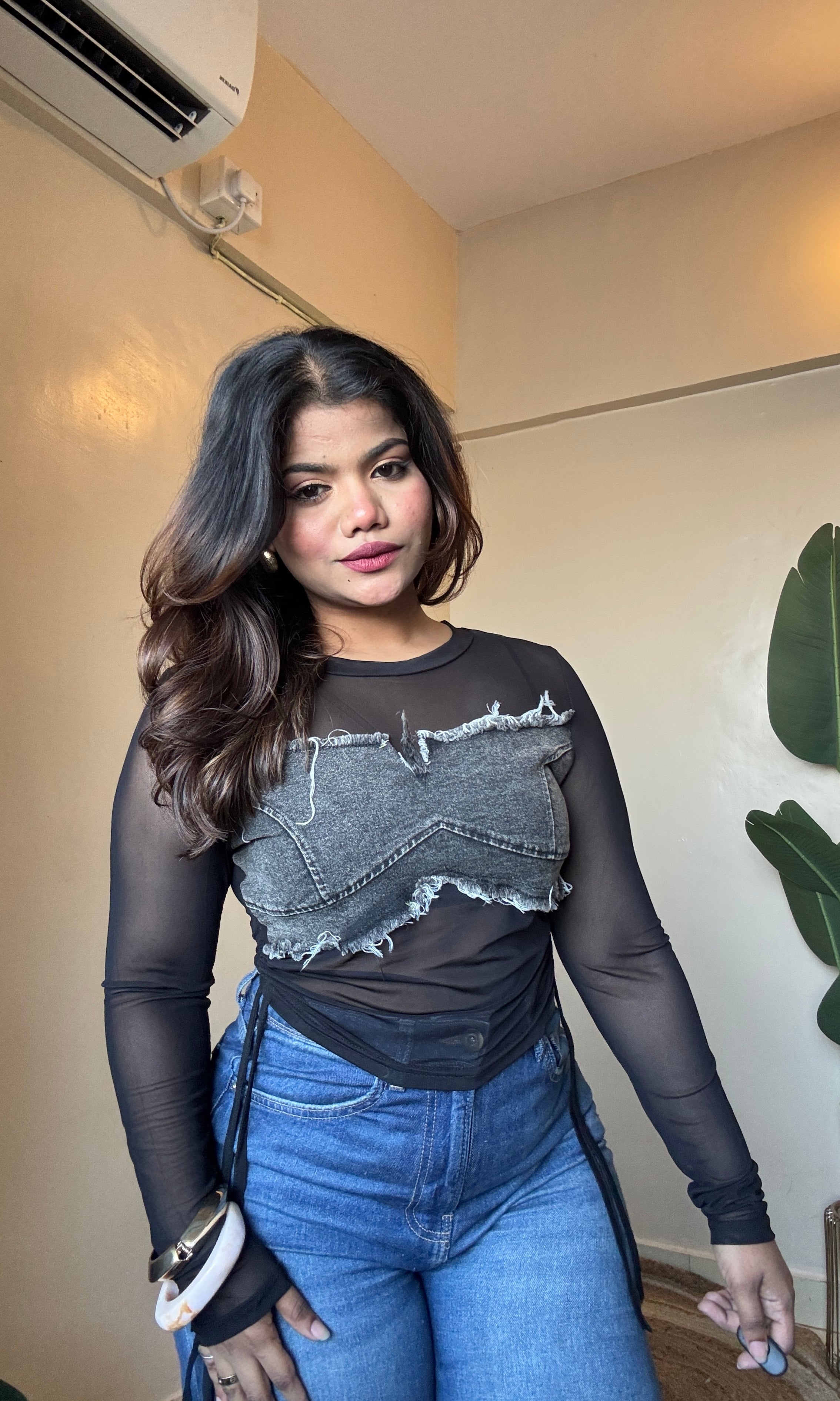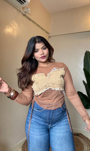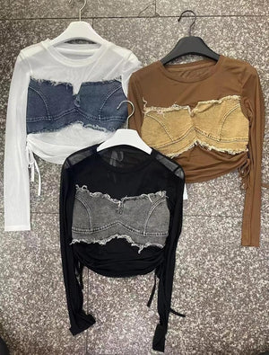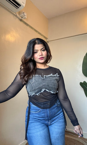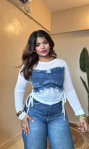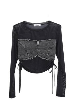 Ruched Denim Mesh Top